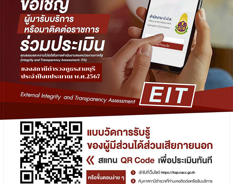 ขอเชิญชวนประชาชนทุกท่าน ร่วมตอบแบบประเมิน แบบวัดการรับรู้ของผู้มีส่วนได้ส่วนเสียภายนอก (EIT) การประเมินคุณธรรมและความโปร่งใสในการดำเนินงานของสถานีตำรวจ ประจำปีงบประมาณ 2567