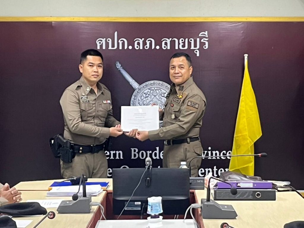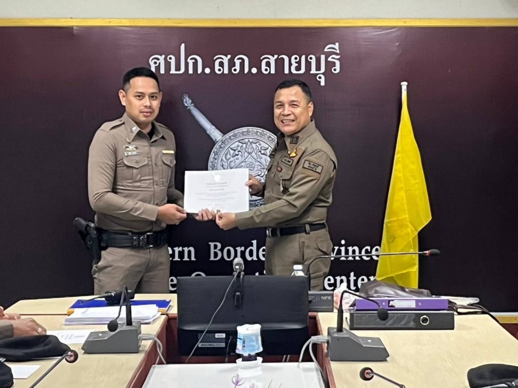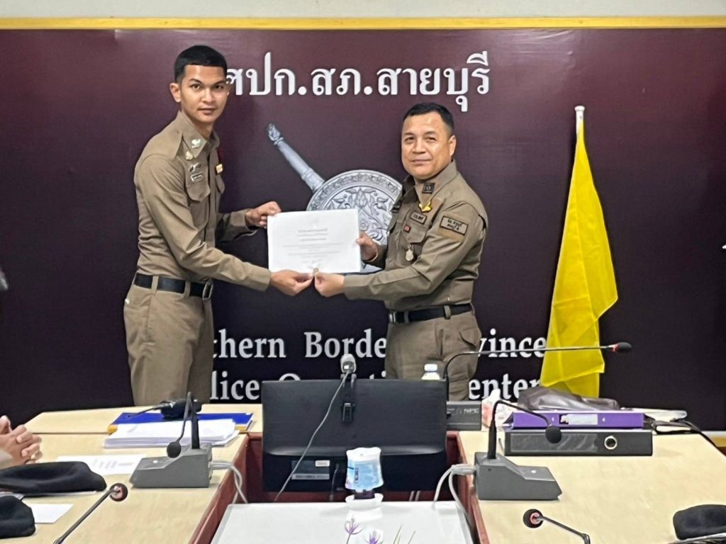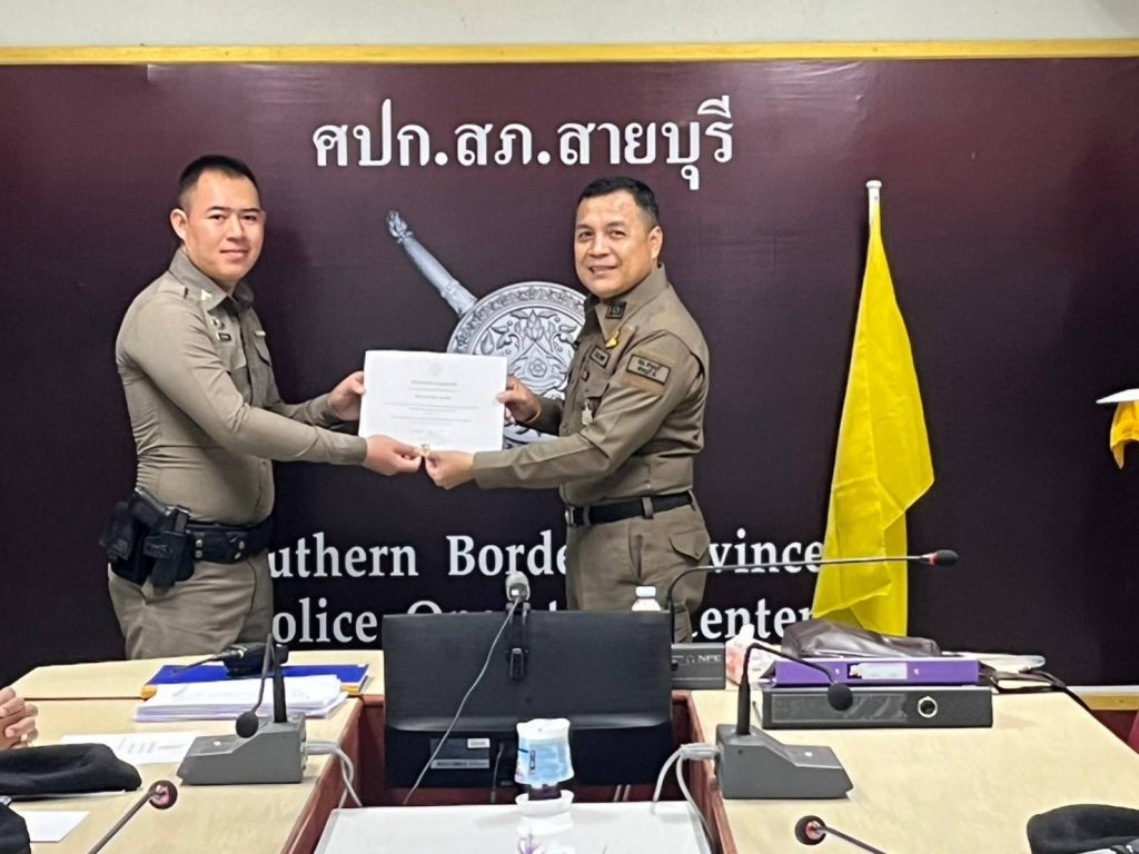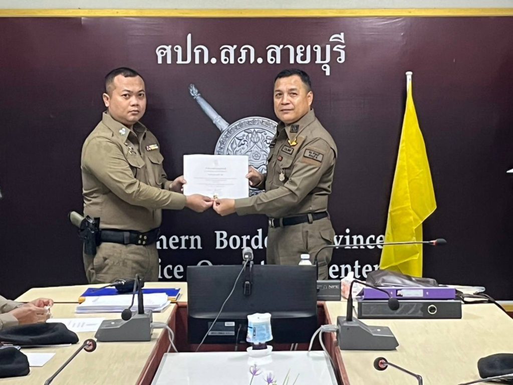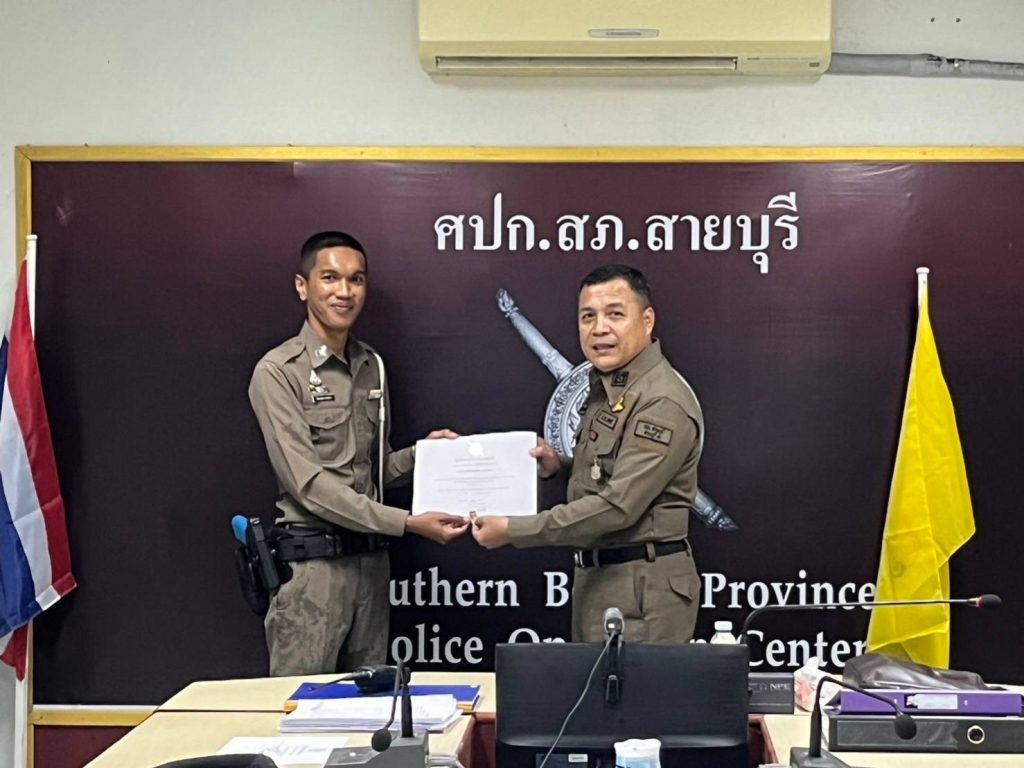 พ.ต.ต.จำนัน ดำรงศักดิ์วิรุฬ สวป.สภ.สายบุรี พ.ต.ต.สมชาย สังข์แก้ว สว.อก.สภ.สายบุรี มอบประกาศษณียบัตรและเหรียญตำรวจสีขาวดาวคุณธรรม แก่ข้าราชการตำรวจที่ประพฤติปฏิบัติดีเยี่ยมตามประมวลจริยธรรมและจรรยาบรรณของตำรวจ