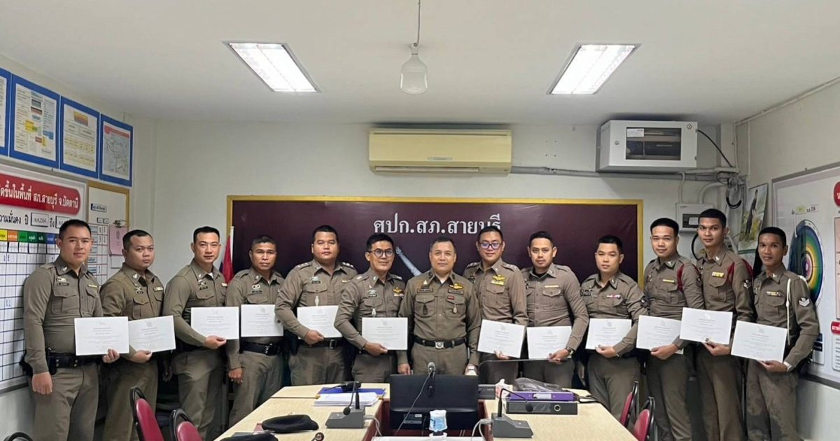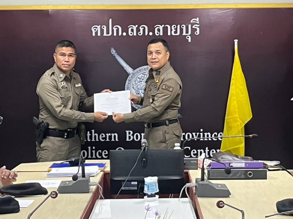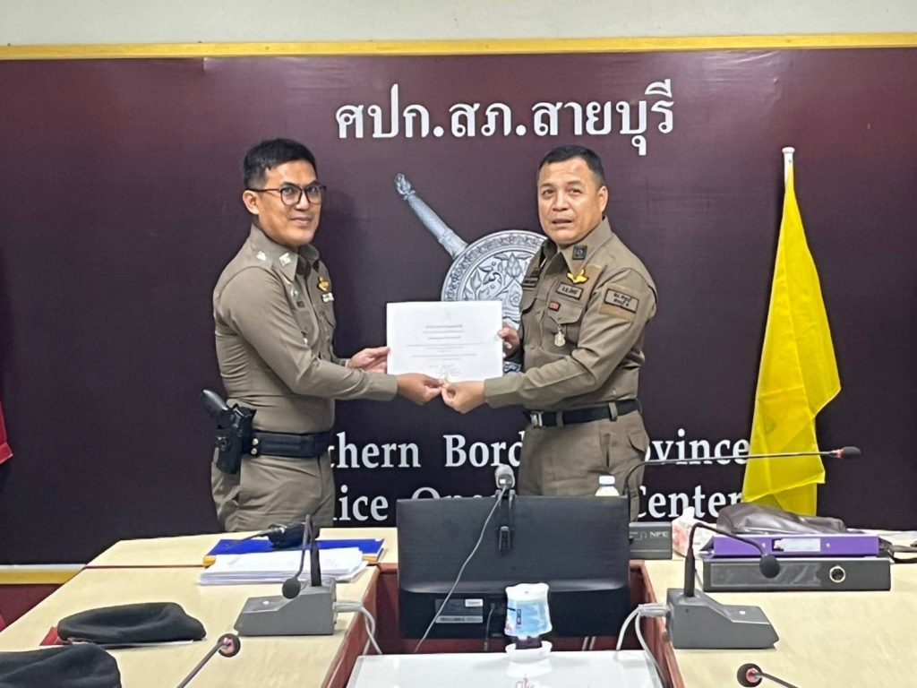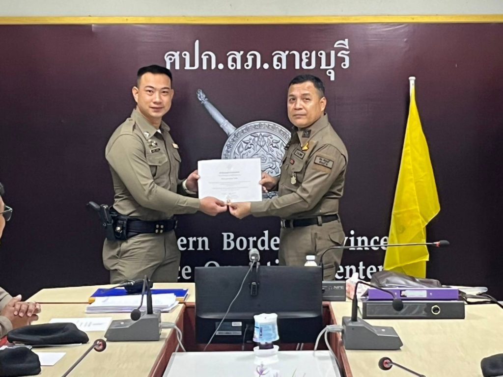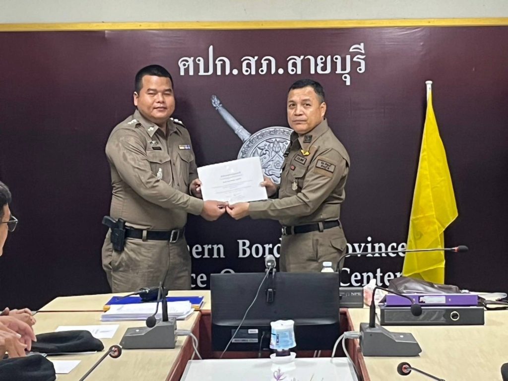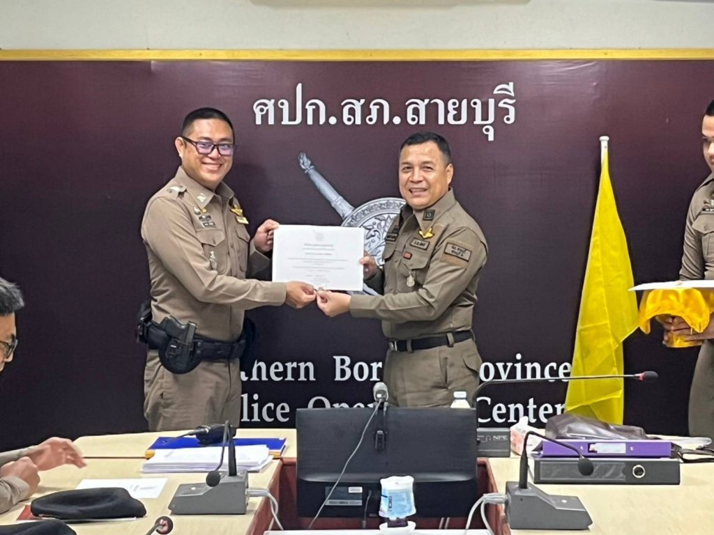 พ.ต.ต.จำนัน ดำรงศักดิ์วิรุฬ สวป.สภ.สายบุรี พ.ต.ต.สมชาย สังข์แก้ว สว.อก.สภ.สายบุรี มอบประกาศษณียบัตรและเหรียญตำรวจสีขาวดาวคุณธรรม แก่ข้าราชการตำรวจที่ประพฤติปฏิบัติดีเยี่ยมตามประมวลจริยธรรมและจรรยาบรรณของตำรวจ