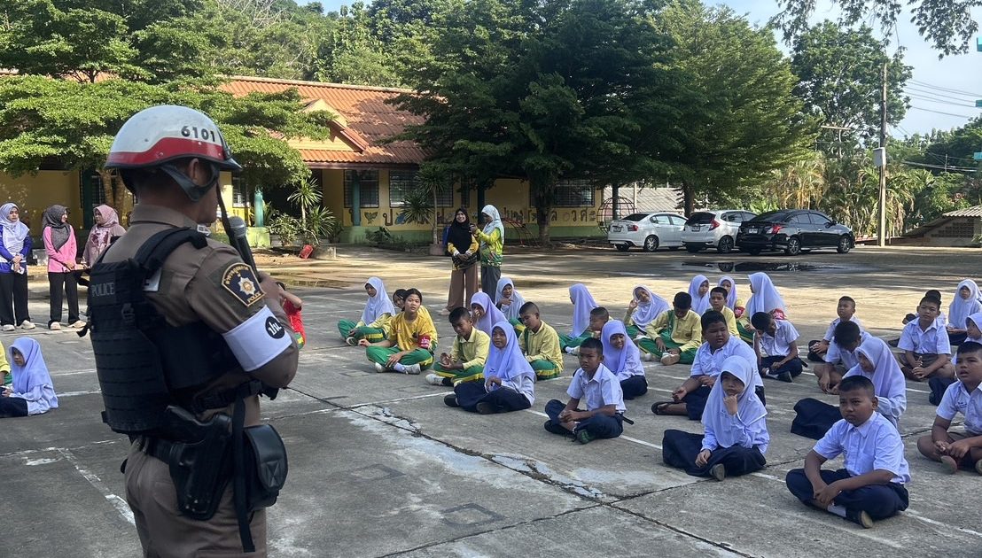เมื่อวันที่ 07 ส.ค. 2568 เวลาประมาณ 08.00น. ภายใต้การอำนวยการของ พ.ต.อ.ธีรพจน์ ยินดี ผกก.สภ.สายบุรี พ.ต.ท.ธัชนนท์ แก้วจันทร์ รองผกก.สภ.สายบุรี พ.ต.ท.อาลี หลีเยาว์ สวป.สภ.สายบุรี มอบหมายให้ ด.ต.แวอามิน แวและ หัวหน้าข่ายจราจร ว.4 บรรยาย พร้อมให้คำแนะนำ และอบรมให้ความรู้กฎหมายจราจรเบื้องต้น การใช้รถใช้ถนนเพื่อลดอุบัติเหตุ ให้กับครูและนักเรียนโรงเรียนเทศบาล 1(บ้านตะลุบัน) เพื่อรับทราบตามกิจกรรม “โครงการครูตำรวจ 5 นาที” โดยมี นางชุติพร สุระกำแหง ผู้อำนวยการโรงเรียนเทศบาล 1 (บ้านตะลุบัน) และคณะครูฯ นักเรียน ให้การต้อนรับ ณ โรงเรียนเทศบาล 1 (บ้านตะลุบัน) ต.ตะลุบัน อ.สายบุรี จ.ปัตตานี