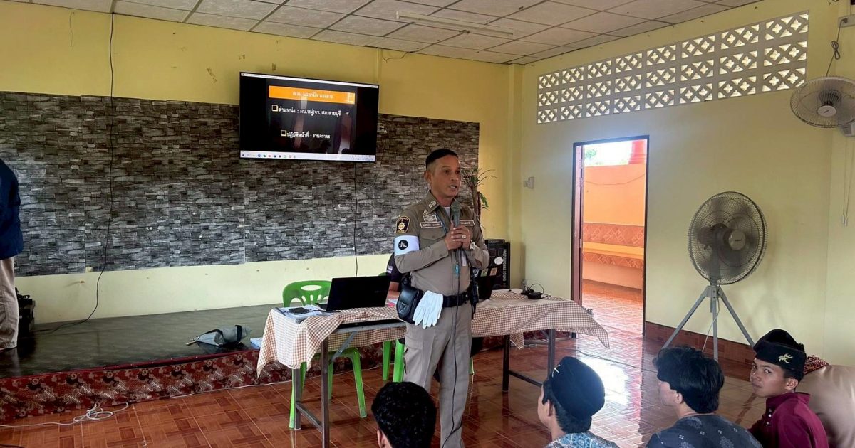 ด.ต. เเวอามิน แวและ หัวหน้างานจราจร พร้อมด้วยเจ้าหน้าที่จราจรจัดอบรมความปลอดภัยทางถนนให้กับนักเรียนโรงเรียนศาสนศึกษาเพื่อให้นักเรียนเห็นความสำคัญ ของกฏจราจร เสริมสร้างวินัยจราจรและปฏิบัติได้อย่างถูกต้อง