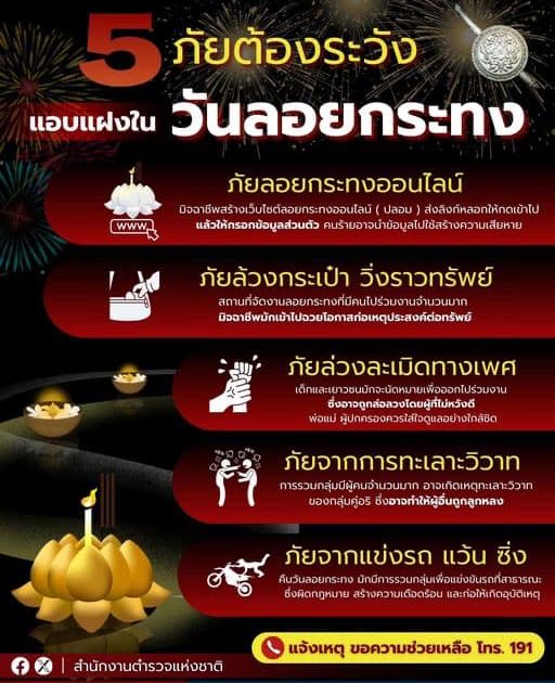5 ภัยต้องระวังแอบแฝงใน วันลอยกระทง 13 พฤศจิกายน 2567 โดย admin / ข่าวประชาสัมพันธ์ FacebookFacebookXXLINELine
