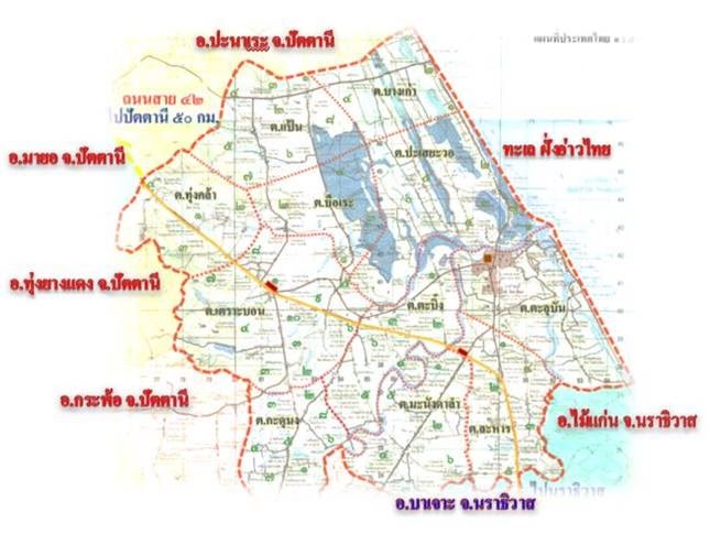 ทิศใต้ : อ.ไม้แก่น จ.ปัตตานี,อ.บาเจาะ จ.นราธิวาส